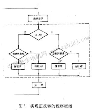 對于三相六拍而言,如果把表中的狀態(tài)字自上而下的順序依次送出Po口,步進電動機三相繞組的通電順序為AB- B- BC-C- CA- A- AB,那么按自下而上的順序依次送出狀態(tài)字,電機的通電順序為AB-AAC- C- CB- B- BA,電機旋轉(zhuǎn)方向相反。因此,實現(xiàn)正反轉(zhuǎn)的程序框圖如圖3 所示。圖中虛線框內(nèi)為調(diào)整狀態(tài)表指針的程序框圖。