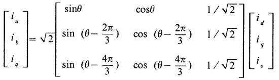 為了直觀,便于同試驗(yàn)結(jié)果比較,定子d,q軸電流應(yīng)轉(zhuǎn)換為a、b、c相電流輸出,其逆變換為