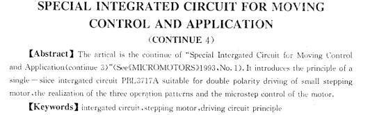【摘 要】本文為“運(yùn)動(dòng)控制專用集成電路及應(yīng)用(續(xù)3)”(見1993年《微電機(jī)》第1期)的續(xù)篇,介紹一種適用于小功率步進(jìn)電動(dòng)機(jī)雙極性驅(qū)動(dòng)的pbl3717a單片集成電路的工作原理,步進(jìn)電動(dòng)機(jī)3種運(yùn)行方式的實(shí)現(xiàn)和微步距控制。