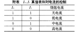 輸入控制信號i0(9腳)和i1(7腳)的4種組合邏輯狀態(tài),對3個(gè)比較器選通,在它們的作用下,實(shí)現(xiàn)對繞組電流的數(shù)字控制,見附表。
