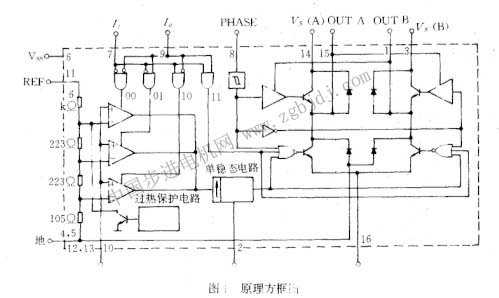 由4個(gè)晶體管組成h全橋功率開關(guān)電路,輸出端為outa(15腳)和outb(16腳)。它們的下橋臂晶體管為共發(fā)射極,從16腳引出,可外接一電阻至地,作電流檢測用。outa和outb外接步進(jìn)電動(dòng)機(jī)的一相繞組,其電流流經(jīng)16啷的電阻,電流信號經(jīng)rece濾波后從10腳送給電流比較器電路(參見圖2)。4個(gè)功率晶體管均并聯(lián)有快速保護(hù)二極管,為繞組提供續(xù)流回路。繞組電流的流向是由8腳的phase信號決定的。它使用ttl電平的控制信號。當(dāng)高電平時(shí),電流由outa流向outb。此時(shí)a半橋上橋臂晶體管持續(xù)導(dǎo)通,a半橋的下橋和b半橋的上橋臂晶體管持續(xù)截止,b半橋的下橋臂晶體管同時(shí)受到單穩(wěn)態(tài)電路來的脈寬調(diào)制信號的控制,此信號高電平時(shí)晶體管截止,低電平時(shí)導(dǎo)通,對繞組電流進(jìn)行斬波控制,使它維持于一定的平均值內(nèi)。當(dāng)phase為低電平時(shí),繞組電流流向相反。phase輸入后經(jīng)過斯密特觸發(fā)電路,具有良好的噪聲抑制作用.還有時(shí)延電路,避免h橋開關(guān)過程中上下橋臂晶體管的直通短路。
