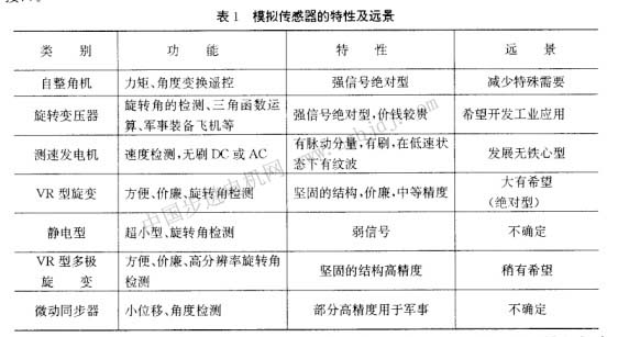 它是正余弦旋變的一種特殊應(yīng)用。隨著伺服系統(tǒng)的高精度和高可靠性的發(fā)展,數(shù)字式相位控制系統(tǒng)的應(yīng)用愈來愈廣泛。近年開發(fā)研制的磁阻式多極移相器是一種基于磁阻變化原理而設(shè)計(jì)的新型元件,它可以在較小機(jī)座號上實(shí)現(xiàn)多極,其精度高于相同尺寸的傳統(tǒng)多極電機(jī)。它可應(yīng)用于高速數(shù)控機(jī)床,高空定位跟蹤系統(tǒng)以及“全天候”的測角系統(tǒng)等。按照一般工作原理來分,磁阻式多極移相器主要用于相位控制位置數(shù)字讀出系統(tǒng)和相位移控制數(shù)字伺服系統(tǒng)。模擬傳感器的特性及遠(yuǎn)景如表1所示。