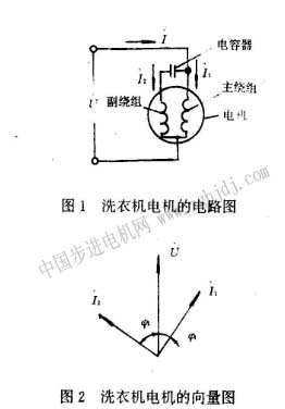 在洗衣機(jī)電機(jī)中,為了獲得轉(zhuǎn)子的起動(dòng)力矩,采用兩種辦法,一是在定子槽內(nèi)嵌放兩個(gè)繞組,即主繞組(運(yùn)行繞組)和副繞組(起動(dòng)繞組),并使這兩個(gè)繞組的中軸線在空間相差90度角;二是在起動(dòng)繞組上串聯(lián)一個(gè)適當(dāng)容量的電容器,如圖1所示。主繞組電路是一個(gè)電感性電路,電流i1在相位上比電壓u滯后ψ1角,而副繞組則是一個(gè)電容性電路,電流i2比u超前ψ2角,只要電容器的容量選擇適當(dāng),就可以使i1和i2間的相位差等于90度,如圖2所示。