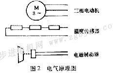 電動機部分系鼠籠轉(zhuǎn)子三相異步電動機,制動器為圓盤式直流電磁制動器,電機上裝有一級圓柱齒輪減速器,并在繞組端部嵌有ptc熱敏電阻作為溫度傳感器。電機結(jié)構(gòu)如圖1所示,電氣原理圖見圖2。