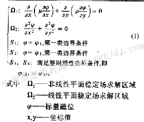 該模型包括定、轉子齒及其齒根后單位齒高鐵心組成的非線性平面穩(wěn)定場和氣隙組成的線性平面穩(wěn)定場。根據(jù)準拉普拉斯方程,這兩部分區(qū)域磁場的偏微分方程邊值為