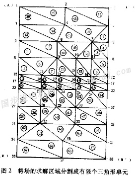 用有限元法求解平面穩(wěn)定磁場的方法是,①首先從建立的偏微分方程邊值出發(fā),找出~個稱為能量泛函數(shù)的積分式,令其在滿足第一類邊界條件的前提下取極值,即構成條件變分。這個條件變分是和偏微分方程邊值等價的。將條件變分代替偏微分邊值,以條件變分為對象求解電磁場。②將場的求解區(qū)域分割成有限個三角形單元,如圖2所示,在每一單元內(nèi)部,近似認為任一點求解函數(shù)是在單元節(jié)點的函數(shù)值之間隨著座標變化而線性變化,在單元中構造出插值函數(shù)。③將插值函數(shù)代入能量泛函數(shù)的積分式,把泛函數(shù)離散化為多元函數(shù)。根據(jù)極值原理,將能量泛函對每一個自變量求解偏導數(shù),并令其等于零,便得到一個線性或非線性代數(shù)方程組,并由邊界條件作修正。④借助電子計算機對代數(shù)方程組求解。