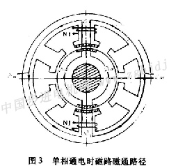 為簡化計,對磁路進行分析計算時,只考慮單相通電時的磁路,忽略另一通電相的影響。單相通電時,磁路磁通路徑如圖3所示。氣隙及齒部分,包括氣隙,定、轉子齒及定、轉子齒根后單位齒高部分鐵心(圖3中畫有斜線及氣隙部分),其磁壓降標為fgt;背鐵部分,包括定子極身、定、轉子軛部,其磁壓降標為ffe。兩部分磁壓降之和應等于磁路總磁勢in(每相安匝),即