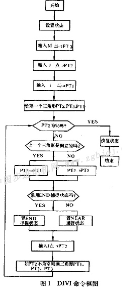 通常的三角形剖分大多是先用弧向線和徑向線將區(qū)域分為網(wǎng)格狀,再用對角線將網(wǎng)格分為三角形單元。本文所述方法只利用弧向線完成剖分。事實上,可沿任意二條曲線進(jìn)行剖分,具有方便性。二條弧線間的部分由auto lisp語言編寫的divi程序?qū)崿F(xiàn),其框圖示于圖1。