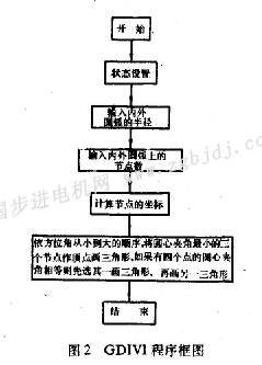 考慮到電機(jī)中大多為圓形,因此編制了沿二條圓角線進(jìn)行自動剖分的auto lisp命令,圖2是該程序gdivi的框圖。