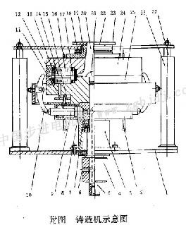 1.底板2.導桿3.軸承座4.回轉接頭5.主軸6.進油口7.盤形缸體8.油缸9.柱塞10.搖臂11.頂桿12.外端模13.鋁環(huán)風扇14.芯軸15.頂桿板16.硅鋼片17.內端模18.推力球軸承19.澆口套20.澆口21.分流器22.提升板23.橫擔24.上模25.下模26.油缸27.活塞桿