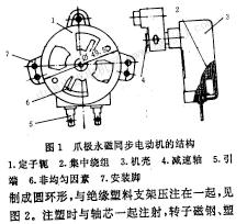 單相爪極同步電動機定子鐵心為4對極,其中2對極在外殼上,另2對極在端蓋上,在外殼的2對極中有一對設計成小磁極,與其它磁極不對稱,這種不對稱定子軟鐵結構可省掉定向裝置而能使電機定向躍入同步后,朝固定方向旋轉。軟鐵定子既是機殼,又兼作磁軛。定子線圈是單相集中繞組。