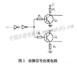 圖3是故障信號處理電路原理圖,其輸入端為碼盤斷路故障信號。當(dāng)系統(tǒng)工作正常時,反相器輸出為一高電平,晶體管q2導(dǎo)通,輸出一低電平使伺服單元使能端打開。電機(jī)可運(yùn)轉(zhuǎn)。同時晶體管q3導(dǎo)通,輸出一高電平,使電機(jī)制動器不在制動狀態(tài)。當(dāng)故障發(fā)生時,反相器輸出為低電平,使制動器釋放,伺服單元使能端閉鎖,電機(jī)停轉(zhuǎn)。