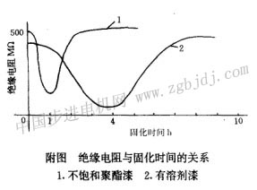 可見,不飽和聚酯無溶劑漆只能用于一般的工頻低壓絕緣,不能用于高頻。在125℃時,聚酯無溶劑絕緣漆和一般有溶劑絕緣漆的絕緣電阻與固化時間的關(guān)系如附圖所示。