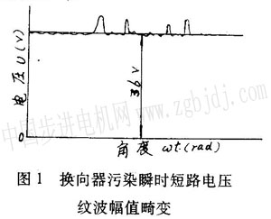 微電機(jī)裝配校驗(yàn)后,根據(jù)機(jī)座口的三個(gè)長(zhǎng)腰形孔道對(duì)端蓋止口進(jìn)行鉆孔攻絲,鉆孔攻絲時(shí)的兩道工序不可避免地將一部分屑沫飛出電機(jī)體外,也不可避免地將一部分屑沫飛入電機(jī)內(nèi)部,與電刷粉塵攪拌在一起。裝配電動(dòng)機(jī)時(shí),換向器端面與含油軸承間沒(méi)有遮擋油污侵害的裝置,電機(jī)經(jīng)較長(zhǎng)時(shí)間運(yùn)行后,金屬粉沫與非金屬粉沫混合物由從含油軸承飛濺滲出的污油攪拌粘于換向器表面,這些灰黑色帶白色混濁物對(duì)電機(jī)運(yùn)行極為不利,換向器兩端紋波變粗(見(jiàn)圖1)。