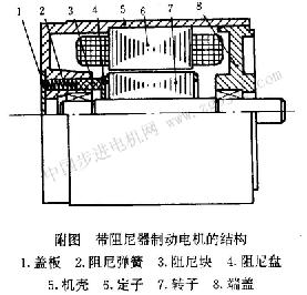 電機配置機械阻尼器后,按國外先進國家的要求,電機在額定電壓切斷時應(yīng)在o.5s內(nèi)制動,且電機本體過轉(zhuǎn)不超過5r/min。電機的基本結(jié)構(gòu)如附圖所示。
