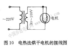 低阻性漏電時仍有幾百至幾千歐的電阻,經(jīng)檢查和判斷是由于受潮而引起時,可進行驅(qū)潮處理:①用電吹風對電機進行驅(qū)潮處理。②放在干燥通風處一定的時間。⑧用大功率燈泡掛在繞組上方,對兩端各烘烤幾小時,將繞組浸漆,再兩端各烘烤5h。④用圖10的接線對電機繞組通以30~100v交流電半小時或更長些,電流維持在額定電流的百分之五十左右,通電1h,繞組即發(fā)熱自行烘干。