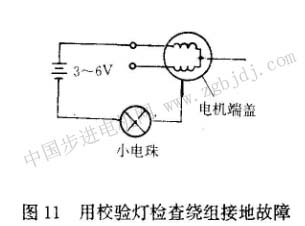 用兆歐表或萬用表分別測量兩繞組引出線端與電機端蓋之間的電阻,當電阻很低、近于零時,即表明繞組接地,此外還可用校驗燈檢查:用一節(jié)電池和一個小電珠串聯(lián)起來,一端分別接在主繞組或副繞組引出線,一端接在電機端蓋上(見圖11)。若小電珠亮了,說明繞組已接地;若小電珠微微發(fā)紅,可能是受潮或不完全接地。也可用大瓦數(shù)的燈泡串聯(lián)在220v交流電源上,分別接于兩繞組引出線和電機端蓋之間,接地時燈泡亮的同時,接地點會產(chǎn)生火花或冒煙,從而可找出接地點。