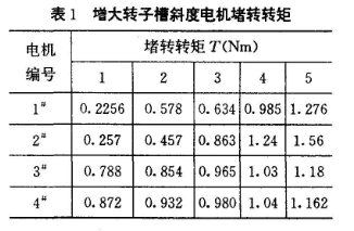 增大轉(zhuǎn)子槽斜度能改善電機(jī)的堵轉(zhuǎn)轉(zhuǎn)矩。以漏磁制動(dòng)電機(jī)yye-1.kw為例,測(cè)得一組數(shù)據(jù),如表1所示。