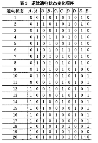 根據(jù)五相混合式步進(jìn)電動(dòng)機(jī)的合成轉(zhuǎn)矩矢量圖[4],可以得到4-5相勵(lì)磁方式和4-4相勵(lì)磁方式下的邏輯通電狀態(tài)變化順序,如表2所示。與之對(duì)應(yīng)的功放電路形式如圖1所示。表2中的“1”代表功率管導(dǎo)通,“0”代表功率管關(guān)斷。其中正轉(zhuǎn)的邏輯通電狀態(tài)變化順序?yàn)?nbsp;  。