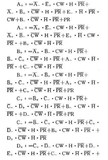 根據(jù)定義,通過對(duì)表2所示邏輯通電狀態(tài)的分析(并不需用多變量卡諾圖的繁雜化簡(jiǎn)過程),便可以得到五相混合式步進(jìn)電動(dòng)機(jī)環(huán)形脈沖分配器的時(shí)序邏輯表達(dá)式: