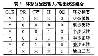 由時(shí)序邏輯表達(dá)式,用gal器件實(shí)現(xiàn)環(huán)形脈沖分配器的設(shè)計(jì)是不難的。目前通用的gal器件(如gal16v8、gal20v8等)只有8個(gè)三態(tài)輸出端,由于五相混合式步進(jìn)電動(dòng)機(jī)共需要10個(gè)輸出端,所以可選用兩片gal器件實(shí)現(xiàn)。由兩片gal16v8構(gòu)成的五相7昆合式步進(jìn)電動(dòng)機(jī)環(huán)形脈沖分配器如圖2(略)。圖中clk和pr輸入端周邊電路是為實(shí)現(xiàn)輸出狀態(tài)自動(dòng)預(yù)置而設(shè)計(jì)的。為了保證預(yù)置的可靠性,參數(shù)選擇必須滿足r2c2>r1c1的關(guān)系。當(dāng)然也可以由外部電路實(shí)現(xiàn)狀態(tài)預(yù)置。根據(jù)圖2可以得到環(huán)形脈沖分配器的輸入/輸出狀態(tài)組合關(guān)系,如表3所示。