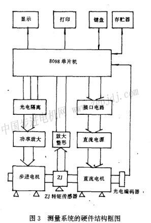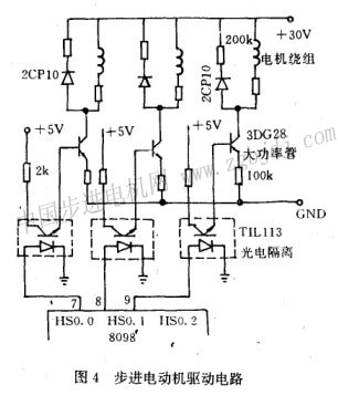 整個(gè)系統(tǒng)分為三大部分。8098單片微機(jī)部分,步進(jìn)電動(dòng)機(jī)驅(qū)動(dòng)和直流電動(dòng)機(jī)控制部分,轉(zhuǎn)矩檢測(cè)和轉(zhuǎn)角測(cè)量部分。微機(jī)部分主要由顯示電路、鍵盤電路、存貯器電路和打印機(jī)等組成。用來(lái)顯示運(yùn)行狀況和測(cè)量結(jié)果、打印報(bào)告單、鍵入有關(guān)常數(shù)以及系統(tǒng)控制等。步進(jìn)電動(dòng)機(jī)的驅(qū)動(dòng)電路如圖4所示。在軟件的控制下,由8098單片機(jī)的高速輸出通道hso.0、hso.1、hso.2輸出脈沖,并通過(guò)光電耦合器til113控制大功率管3dg28的導(dǎo)通與截止,實(shí)現(xiàn)步進(jìn)電動(dòng)機(jī)繞組的通電與斷電,達(dá)到步進(jìn)目的。光電隔離的作用是將計(jì)算機(jī)部分和大功率部分隔離開(kāi),以防止強(qiáng)信號(hào)竄入計(jì)算機(jī)部分,造成不應(yīng)有的故障。