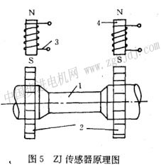 轉(zhuǎn)矩的測(cè)量是通過(guò)zj型轉(zhuǎn)矩傳感器實(shí)現(xiàn)的。zj傳感器的原理圖如圖5所示。中間為一彈性軸1,其兩端安裝有兩個(gè)相同齒數(shù)的齒輪2,每個(gè)齒輪的外側(cè)各安裝一塊磁鋼4,磁鋼上備繞有信號(hào)線圈3。當(dāng)轉(zhuǎn)軸旋轉(zhuǎn)時(shí),由于磁鋼與齒輪間的氣隙磁導(dǎo)隨著齒槽位置的變化而發(fā)生周期性的變化,使穿過(guò)信號(hào)線圈的磁通萬(wàn)也發(fā)生周期性的變化,于是在信號(hào)線圈中分別感應(yīng)出電勢(shì),在外加轉(zhuǎn)矩時(shí),彈性軸的一端相對(duì)另一端產(chǎn)生偏轉(zhuǎn)角笳,a與外加轉(zhuǎn)矩成正比。在兩個(gè)信號(hào)線圈中感應(yīng)電勢(shì)的相位差角也隨轉(zhuǎn)矩的變化而發(fā)生相應(yīng)的變化。兩個(gè)線圈中的感應(yīng)電勢(shì)為u1、u2: