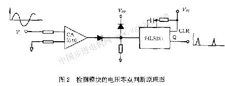 檢測模塊的電壓零點(diǎn)判斷原理如圖2所示。 變送器輸出的交流信號di(0~5v)經(jīng)飽和放大整形成等相方波,然后在74ls211內(nèi)變成等相尖脈沖信號。每個脈沖的上升沿引起一次中斷,中斷服務(wù)程序,即在兩次中斷時間內(nèi)(即一個周期內(nèi))均勻地對電壓、電流信號同時采樣100點(diǎn),再利用式1)、(2)分別計算出電流、電壓及功率值。