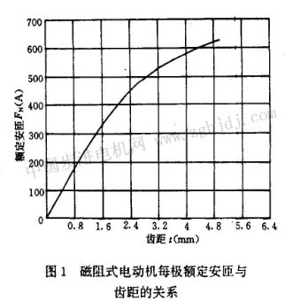 理論分析和實(shí)際研究表明,磁阻式電動(dòng)機(jī)和混合式電動(dòng)機(jī)的每極勵(lì)磁安匝與電機(jī)的齒距值有直接關(guān)系。例如,圖1所示的是我國磁阻式步進(jìn)電動(dòng)機(jī)額定勵(lì)磁安匝統(tǒng)計(jì)數(shù)據(jù)的平均曲線[6],曲線表明了每極勵(lì)磁安匝隨轉(zhuǎn)子齒距增大而上升的明顯趨勢和規(guī)律(曲線僅僅是統(tǒng)計(jì)數(shù)據(jù)的平均值,不可能與具體電機(jī)的數(shù)據(jù)完全一致)?梢姡谙嗤蛳嘟X距時(shí),比較磁阻式和混合式電動(dòng)機(jī)的勵(lì)磁安匝才是比較合理的。為此選了兩種電動(dòng)機(jī),它們具有相同的機(jī)殼外徑和轉(zhuǎn)子齒數(shù)。