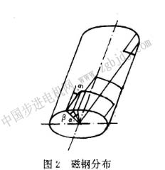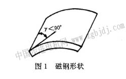 設(shè)磁鋼形狀如圖1所示,磁鋼的弧面與側(cè)面不垂直,呈圓弧狀平行四邊形結(jié)構(gòu)。一個(gè)磁極由j塊完全相同的磁鋼沿軸均勻分布而圖1磁鋼形狀成,每塊磁鋼側(cè)面偏離轉(zhuǎn)子軸向口,弧度,側(cè)面沿圓周方向扭過的弧度為p,相鄰兩磁鋼之間錯(cuò)位的弧度為口(見圖2)。