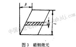 對(duì)于傾斜磁鋼,如果將磁鋼細(xì)分成無窮多段,如圖3所示,則每微段磁鋼產(chǎn)生的磁通在定子導(dǎo)體中感應(yīng)的同一次諧波電勢(shì)存在著相位差,使得合成的同次諧波電勢(shì)得到削弱,削弱的程度,可用類似于斜槽分?jǐn)?shù)的傾斜系數(shù)表示。