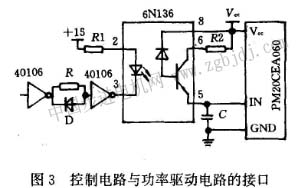 本文所設(shè)計(jì)的采用pm20cea060構(gòu)成的電機(jī)功率驅(qū)動(dòng)電路應(yīng)用于lkw永磁交流伺服系統(tǒng)中,其直流母線電壓為300vdc,由三相220v交流電直接整流得到。為避免功率側(cè)的高電壓對控制電路造成損壞,采用高速光電耦合器6n136進(jìn)行隔離。由于pm20cea060采用的是壓控型igbt功率器件,且模塊內(nèi)集成有基極驅(qū)動(dòng)電路,所需的驅(qū)動(dòng)電流很小,6n136可直接提供,無需進(jìn)行放大,如圖3所示。為避免功率模塊上、下橋臂瞬時(shí)直通造成損壞,該接口電路中設(shè)計(jì)有延遲導(dǎo)通功能,通過調(diào)整電阻r的阻值,可改變延遲時(shí)間,系統(tǒng)中設(shè)定為6μs。驅(qū)動(dòng)電路供電電源采用模塊式dc-dc變換器15s15/80提供,這種方式具有隔離性能好、體積小、可靠性高的優(yōu)點(diǎn)。對pm20cea060的故障保護(hù)是通過兩方面實(shí)現(xiàn)的: