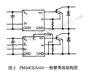 pm20cea060是日本三菱公司為滿足用戶對逆變器用功率開關(guān)高性能、多功能、高可靠性等方面的要求而開發(fā)的一種新型集成化智能功率模塊。這種功率模塊為三相六單元結(jié)構(gòu),內(nèi)部集成有相應(yīng)的功率輸出單元、功率開關(guān)驅(qū)動(dòng)電路及故障檢測保護(hù)電路,其一個(gè)橋臂的等效結(jié)構(gòu)圖如圖2所示。
