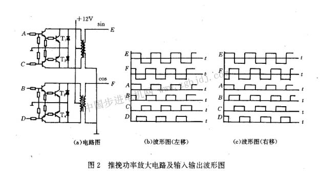 可以由功率放大電路輸出端e、f兩點(diǎn)的波形來(lái)分析a、b、c、d各點(diǎn)的波形。為了方便,不妨分析系統(tǒng)空載時(shí)各點(diǎn)的波形,此時(shí)e、f點(diǎn)的波形分別為兩相幅值相等、相位相差90度的方波。假設(shè)e點(diǎn)波形滯后于f點(diǎn),且a、b點(diǎn)產(chǎn)生正電壓時(shí),e、f點(diǎn)也為正電壓,則易得a、b:c、d各點(diǎn)的時(shí)序圖,如圖2b所示。分析各點(diǎn)波形,可以看出a、百、c、d各點(diǎn)的態(tài)序在一個(gè)時(shí)間周期內(nèi)完成從a到d的數(shù)字逐次左移過(guò)程: