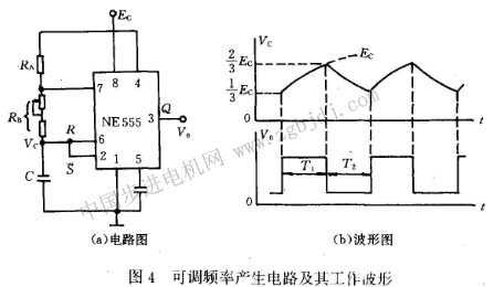 可調(diào)的頻率產(chǎn)生電路是由以ne555定時(shí)器為主構(gòu)成的可調(diào)多諧振蕩器組成,如圖4a所示,其工作原理如下:
