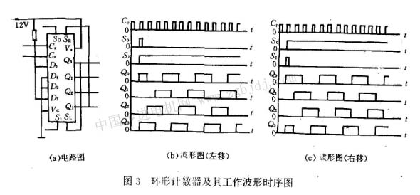 要完成從a到d的數(shù)字循環(huán)左、右移過(guò)程,只需一個(gè)環(huán)形計(jì)數(shù)器即可,在這里選用了集成芯片cd40194,如圖3a所示。當(dāng)環(huán)形計(jì)數(shù)器的觸發(fā)喘輸入一個(gè)脈沖,則輸出的四個(gè)管腳qo、q1、q2、q3的狀態(tài)就一起變動(dòng)一次,且依次相差90度,即自動(dòng)地具有了鑒相的功能,輸出波形分別與a、b、c、d各點(diǎn)的波形一樣(如圖3b、c所示)。由圖中可知供給環(huán)形計(jì)數(shù)器的頻率為輸出電壓頻率的4倍。環(huán)形計(jì)數(shù)器輸出端的數(shù)字左、右移過(guò)程正好分別對(duì)應(yīng)于超聲波電機(jī)的正、反轉(zhuǎn),滿足了對(duì)電機(jī)正反轉(zhuǎn)的要求。