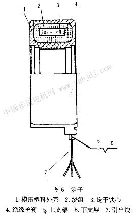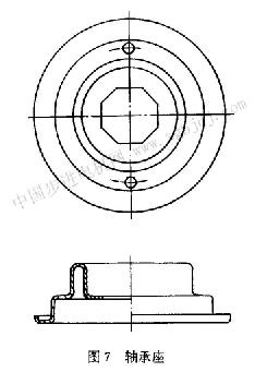 2.5全塑殼定子 帶繞組定子鐵心是由兩個半圓定子鐵拼裝,采用熱固性塑料壓鑄,經(jīng)整體塑封的子。它不但結(jié)構(gòu)牢固、絕緣好,而且體積和都比普通電機縮小或減/3-1/4,從而省材料、工時,降低了成本,提高了電性能圖6)。 2.6軸承座 軸承座系采用1.5mm鋼板沖制而威其軸承孔需經(jīng)整形(無切削)才能達到精度求,并應(yīng)保證與外圈(與塑殼定子的配合面的同軸度。這種結(jié)構(gòu)簡單合理,需再用螺釘進行裝配(見圖7)。