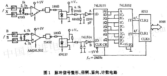 一般,f0》f,則m《n,這樣在丁內(nèi)采樣到整數(shù)個(gè)電機(jī)脈沖m,則由標(biāo)準(zhǔn)頻率f0采樣引起的量化誤差可忽略。在低速段為保證每采樣周期得到整個(gè)脈沖數(shù),則每轉(zhuǎn)脈沖數(shù)越多越好,測(cè)速越精確,一是通過倍頻來提高,二是通過加長(zhǎng)低速段的采樣周期丁。如圖1鑒向倍頻線路的輸出1y、2y直接接到8253的clkl和clk2端,clk0用于標(biāo)準(zhǔn)時(shí)鐘fcp的計(jì)數(shù)。