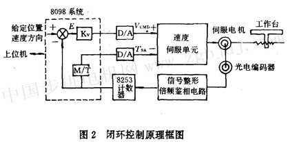 了三臺(tái)直流伺服電機(jī),其型號(hào)為b8—5,即o.8kw,反饋元件僅安裝有脈沖編碼器。因此cnc系統(tǒng)不僅要實(shí)現(xiàn)位置計(jì)數(shù)與控制,還要給出速度反饋電壓,供伺服單元使用。為了提高伺服電機(jī)的調(diào)速與伺服性能。反饋信號(hào)的準(zhǔn)確檢測(cè)、實(shí)時(shí)快速控制是穩(wěn)定性與精度的保證與前提,本文針對(duì)僅帶有光碼盤作為檢測(cè)器的這類伺服系統(tǒng),介紹與之相適應(yīng)