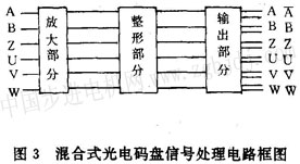 在光電碼盤中,受光元件所檢測(cè)出的微弱信號(hào)的處理有多種不同的方案。由于光電二極管的受光面積只有1mm2數(shù)量級(jí),在電機(jī)旋轉(zhuǎn)時(shí),其每次受光的時(shí)間又很短,所以即使光電二極管有較高的響應(yīng)速度,它所產(chǎn)生的信號(hào)電流也只有微安級(jí),并且該信號(hào)中還存在共模干擾,所以其處理電路應(yīng)具有放大、比較整型和輸出幾個(gè)環(huán)節(jié),圖3是混合式光電碼盤的信號(hào)處理電路框圖。