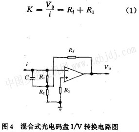 需要特別加以說明的是,由于光電二極管為光伏探測(cè)元件,它在負(fù)載電阻很小的條件下具有較高的響應(yīng)特性,在零負(fù)載電阻下具有****的靈敏度,典型的i/v轉(zhuǎn)換的電路結(jié)構(gòu)如圖4所示,其轉(zhuǎn)換率為: