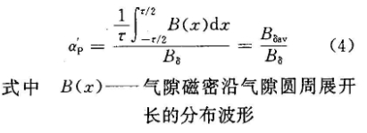 從圖2和式(4)可見,計(jì)算極弧系數(shù)的物理意義是假想每極氣隙磁通集中在計(jì)算極弧長度bp范圍內(nèi),并認(rèn)為在這個(gè)范圍內(nèi)氣隙磁場(chǎng)均勻分布,其磁密等于****值。計(jì)算極弧系數(shù)即為極弧計(jì)算長度與極距之比: