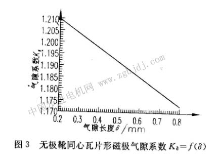 本文通過對(duì)無極靴的同心瓦片形磁極、有極靴的同心瓦片形磁極和等外徑拼塊式的瓦片形磁極電機(jī)設(shè)計(jì)方案的計(jì)算分析,給出了氣隙系數(shù)和計(jì)算極弧系數(shù)與其相關(guān)量之間的關(guān)系曲線。這些曲線不僅反映了氣隙系數(shù)和計(jì)算極弧系數(shù)與其相關(guān)量之間的定量關(guān)系,更重要的是反映出了這些參數(shù)隨不同選取值時(shí)的變化趨勢(shì)。