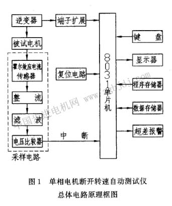 上海電器科學研究所于1990年底研制了單相電機斷開轉速測量儀,通過檢測與轉速成正比的電壓信號,經(jīng)峰值采樣,模數(shù)轉換,顯示電機斷開轉速與同步轉速的百分比,該儀器的測量精度為土百分之5。文獻2只對微機測試瞬時轉速進行了討論,提出了一些方法,但并未提及斷開轉速具體的測量精度及范圍。本文介紹的測量儀具有測量精度高、時間短、自動化程度高等優(yōu)點。