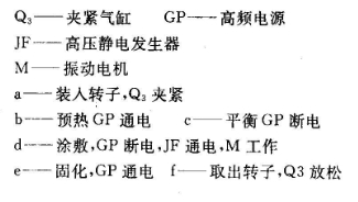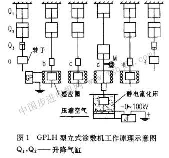該機有一個可供裝夾轉(zhuǎn)軸用的氣動彈性夾頭,一個工二位升降機構(gòu),一個供感應(yīng)加熱用的高頻感應(yīng)加熱線圈,并與高頻感應(yīng)加熱電源相匹配,一個超級流化床和帶靜電的粉通并配有高壓靜發(fā)生器,設(shè)備工作原理示意圖,如圖1所示。