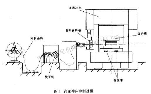 在微電機行業(yè)中,定、轉子鐵心是電機的重要部件,它的質量好壞,直接影響到電機的技術性能。傳統(tǒng)電機定、轉子鐵心制造工藝是用一般沖電沖制出定、轉子沖片(散片),經過齊片,再用鉚釘鉚結、扣片、氬弧焊等方法制成鐵心,對于交流電機轉子鐵心還需用手工進行扭轉出斜槽,步進電機要求定、轉子鐵心磁性能和厚度方向均勻,定子鐵心和轉子鐵心沖片之間分別要求旋轉一定的角度,如用傳統(tǒng)方法制作,效率低,精度很難達到技術要求。隨著工業(yè)生產技術的不斷發(fā)展,在電機、電器等技術領域,已廣泛采用高速沖壓多工位級進制造自動疊片式結構鐵心,如各種微電機的定、轉子鐵心,山字形、u字形、小型變壓器鐵心等,其中定、轉子鐵心還可帶扭轉疊斜槽、沖片之間帶大角度回轉疊鉚結構等,與普通沖模相比,多工位級進模具有沖制精度高、生產效率高、使用壽命長、所沖制鐵心尺寸精度一致性好、容易實現自動化、適合大批量生產等優(yōu)點,是微電機行業(yè)精密模具發(fā)展的方向。定轉子鐵心自動疊鉚級進模的沖制過程是,從沖制條料(卷料)通過校平機、自動送料器、自動加油潤滑裝置進入多工位級進模,通過各工值的沖制,到轉子鐵心和定子鐵心從模具中通過輸送帶輸送出,所留條料搭邊由高速沖床上專用廢料刀切斷(或有專用切廢料機切斷,或在級進模上專用廢料凸模進行切斷),整個過程自動進行,如圖1所示。其中自動疊鉚、轉子帶扭疊鉚、大角度回轉疊鉚沖制工步都是放在定、轉子沖片落料工位上完成的。定、轉子自動疊鉚級進亨穆霉有制造精度高、結構先進、帶有技術性要求高的回轉機構、計數分離機構及安全機構等,級進模的主要零件凸模、凹模采用硬質合金,每磨一次刃口可沖100萬次以上,模具總壽命在1億次以上。