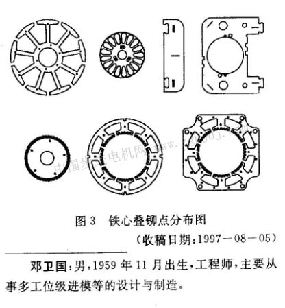要求。疊鉚點在鐵心上分布應對稱和均勻,疊鉚點數量及大小應根據鐵心沖片之間結合牢大小確定,同時必須考慮模具制造工藝性,如鐵心沖片之間帶有大角度回轉登鉚的·還要考慮疊鉚點的等分要求等。圖3表示定、轉子鐵心的疊鉚點分布。(待續(xù))
