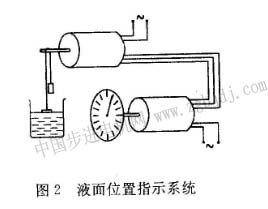 發(fā)送方的自整角機(jī)稱作力矩式自整角發(fā)送機(jī),而接收方的自整角機(jī)稱作力矩式自整角接收機(jī),發(fā)送機(jī)和接收機(jī)的原端為單相繞組,由交流電源供電激磁,負(fù)端為三相繞組,端點依次互相聯(lián)接。當(dāng)發(fā)送機(jī)轉(zhuǎn)子偏轉(zhuǎn)某一角度時,其定子繞組輸出一個相應(yīng)的電壓,使接收機(jī)的轉(zhuǎn)子沿同一方向偏轉(zhuǎn)同一角度。當(dāng)發(fā)送機(jī)的轉(zhuǎn)子以某一速度旋轉(zhuǎn)時,接收杌的轉(zhuǎn)子也以同一速度跟隨旋轉(zhuǎn),使兩者的轉(zhuǎn)軸協(xié)調(diào)動作,這種同步聯(lián)接系統(tǒng)通常用來進(jìn)行遠(yuǎn)距離的信號傳輸和指示。如遠(yuǎn)距離指示液面高度、閥門開度、電梯、礦井提升高度等。圖2為指示液面位置的示意圖,浮子隨液面上升或下降,通過繩索帶動自整角發(fā)送機(jī)轉(zhuǎn)子轉(zhuǎn)動,自整角接收機(jī)的轉(zhuǎn)子便會帶動指針隨之轉(zhuǎn)動,準(zhǔn)確指出液面高低。