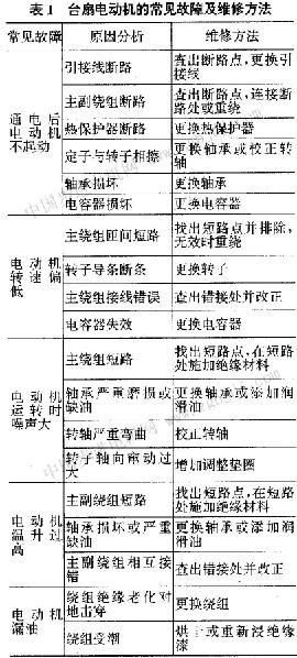 正確使用臺扇可以****限度發(fā)揮電動機(jī)的功能。如果使用不當(dāng)或使用日久,絕緣老化,潤滑油干枯等,會導(dǎo)致電動機(jī)產(chǎn)生故障,甚至燒壞電動機(jī)。當(dāng)電動機(jī)出現(xiàn)故障時,應(yīng)及時將故障排除,以提高電動機(jī)運(yùn)行的可靠性。臺扇電動機(jī)的一般常見故障、產(chǎn)生原因及維修方法如表1所示。
