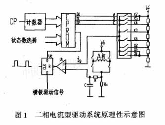 圖1所示為二相電流型驅(qū)動(dòng)系統(tǒng)原理性示意圖,對(duì)于20狀態(tài)、10狀態(tài)、8狀態(tài)、4狀態(tài),其最小公倍數(shù)為40,因此計(jì)數(shù)器為- 40進(jìn)制的計(jì)數(shù)器,配合以2位狀態(tài)數(shù)選擇信號(hào),與eprom組成環(huán)形分配器并發(fā)出 |